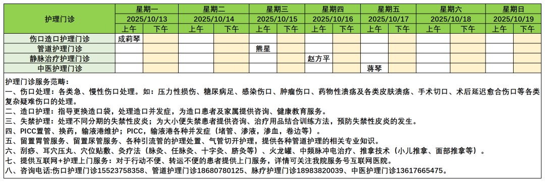 为方便您合理安排就诊时间,现将我院10月13日-19日日间门诊出诊、夜间门诊、护理门诊、健康宣教、多学科联合(MDT)门诊安排公示如下: