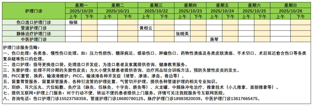 10月20日-26日护理门诊安排