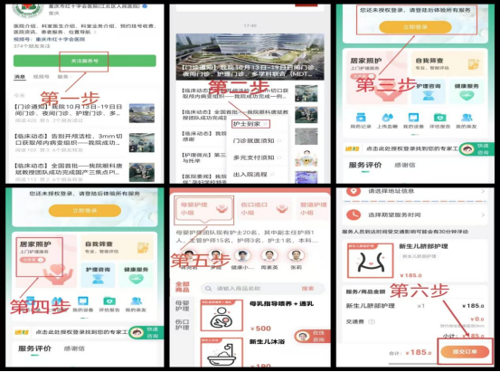 关注“重庆市红十字会医院(江北区人民医院)”微信公众号→ 底部菜单“患者服务”→ “护士到家”→ 选择“母婴护理小组”→ 选择需要的服务→ 最后支付完毕,坐等护士上门!