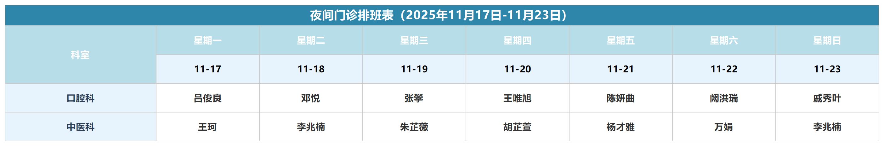 为方便您合理安排就诊时间,现将我院11月17日-11月23日日间门诊出诊、夜间门诊、护理门诊、健康宣教、多学科联合(MDT)门诊安排公示如下:
