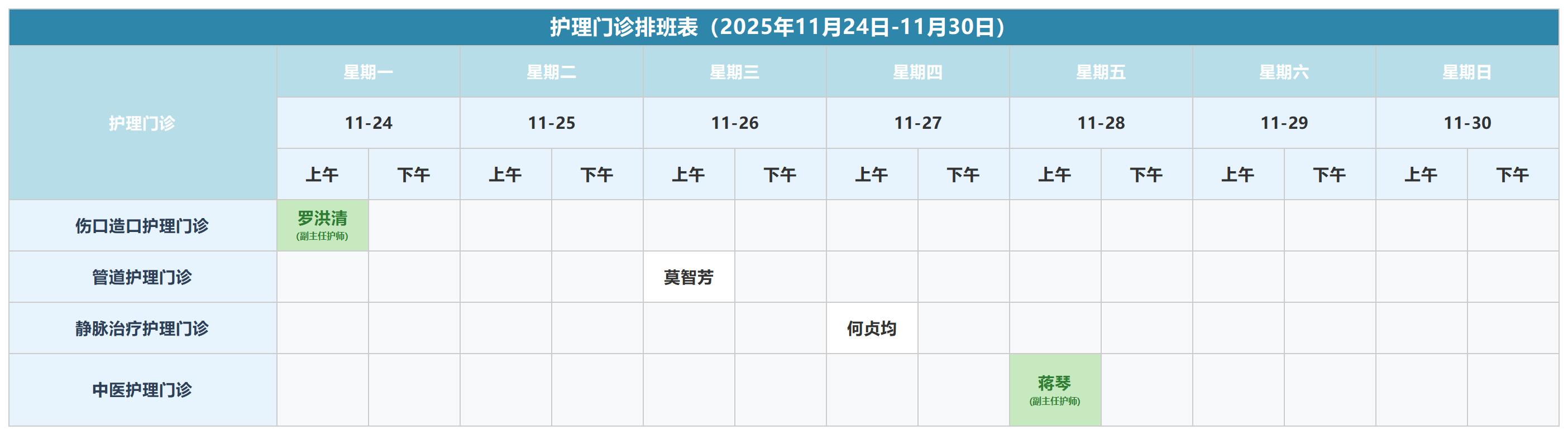 为方便您合理安排就诊时间,现将11月24-30日我院日间门诊出诊、夜间门诊、护理门诊、健康宣教、多学科联合(MDT)门诊安排公示如下: