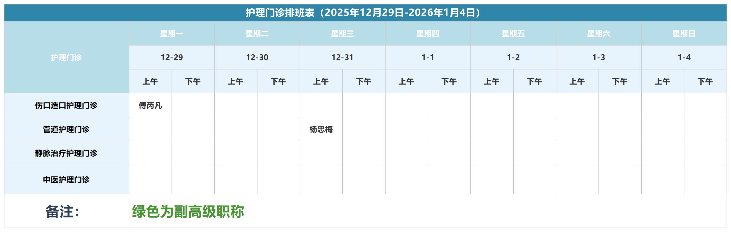 为方便您合理安排就诊时间,现将12月29日-1月4日我院日间门诊出诊、夜间门诊、护理门诊、健康宣教、多学科联合(MDT)门诊安排公示如下: