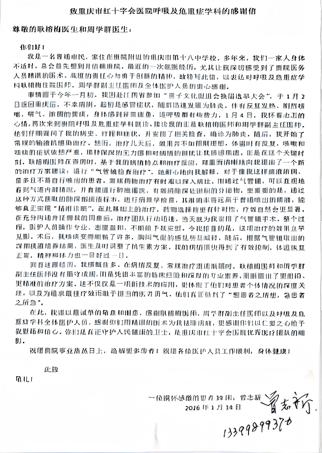 肺癌术后遭遇严重肺部感染,咳嗽喘累、浓痰堵气道,常规治疗效果不佳怎么办?我院呼吸与危重症医学科接诊的曾先生(化名),就经历了这样一场 “呼吸危机”。从抗拒到信赖,从病情反复到顺利康复,电子支气管镜这项 “呼吸清道夫”技术,不仅帮他打通了气道,更让他亲身感受到精准医疗的力量——康复后,曾先生特意写下感谢信,向周学群副主任医师、耿榕梅住院医师及全体医护人员表达由衷谢意。
