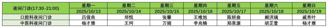 为方便您合理安排就诊时间,现将我院10月13日-19日日间门诊出诊、夜间门诊、护理门诊、健康宣教、多学科联合(MDT)门诊安排公示如下: