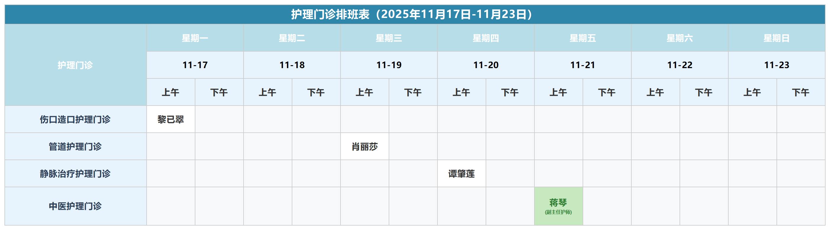 为方便您合理安排就诊时间,现将我院11月17日-11月23日日间门诊出诊、夜间门诊、护理门诊、健康宣教、多学科联合(MDT)门诊安排公示如下: