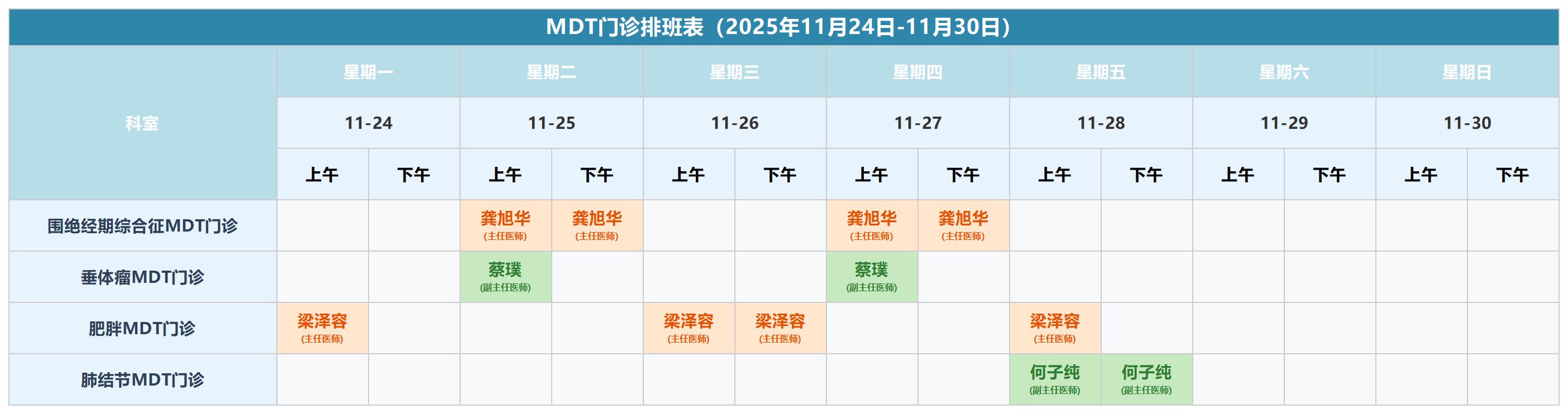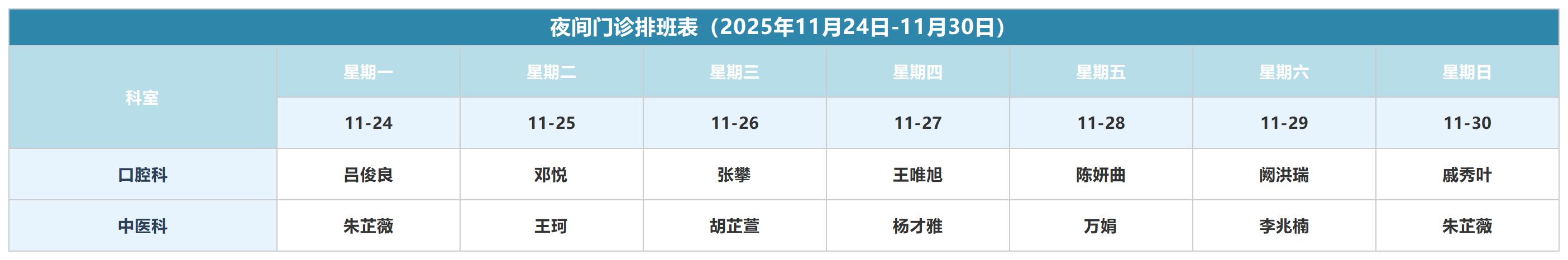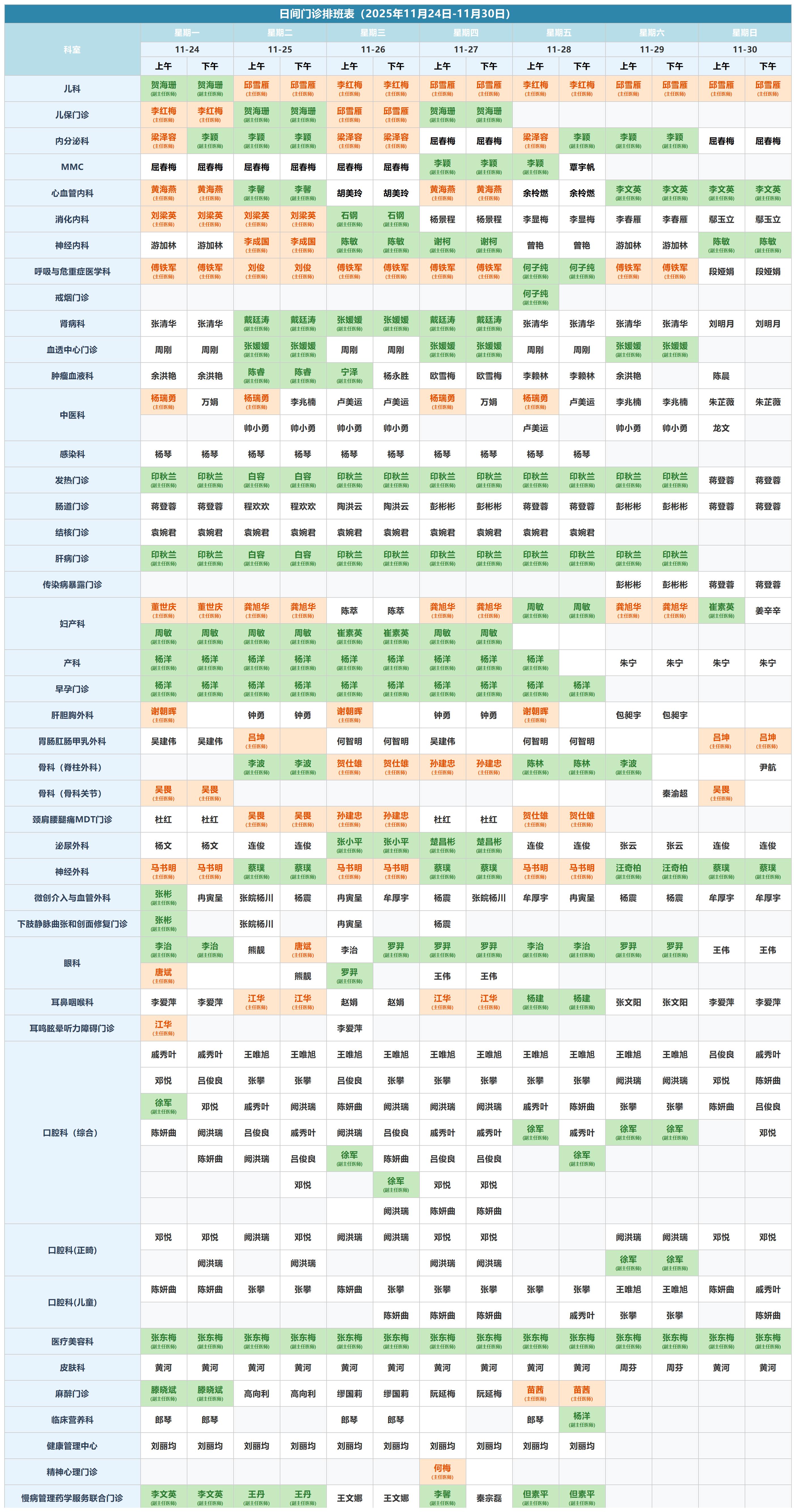 为方便您合理安排就诊时间,现将11月24-30日我院日间门诊出诊、夜间门诊、护理门诊、健康宣教、多学科联合(MDT)门诊安排公示如下:
