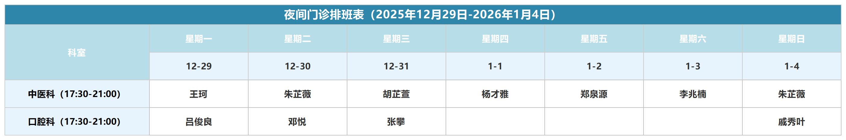 为方便您合理安排就诊时间,现将12月29日-1月4日我院日间门诊出诊、夜间门诊、护理门诊、健康宣教、多学科联合(MDT)门诊安排公示如下: