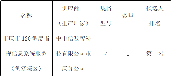 重庆市120调度指挥信息系统服务(鱼复院区)采购评审工作现已结束,评审结果如下: