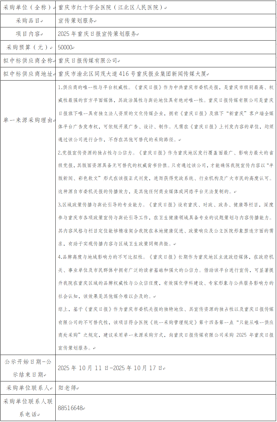 2025年重庆日报宣传策划服务单一来源协商公示